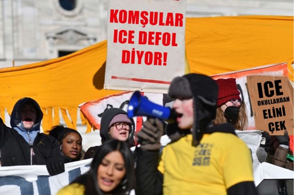 (fotoğraf:Lise öğrencileri, 14 Ocak 2026’da Minnesota eyaletinin başkenti St. Paul’daki Eyalet Meclis Binası önünde, federallerin yaptığı göçmen göz altılarının ve göçmenlere yönelik diğer yaptırımların sona erdirilmesi için bir ICE karşıtı protesto düzenledi).