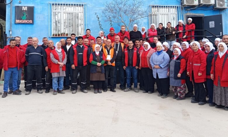 Uzun yıllardan sonra kadroya alınarak güvenceli ve toplu iş sözleşmeli çalışma yaşamına kavuşan Migros depo işçileri ile buluşmaya devam ediyoruz. Bu çerçevede Sendikamız Bursa Şube Başkanı Emrullah Halıcı, Şube İdari Sekreteri Rıca Çakmak ve Şube Denetim Kurulu Üyesi Bekir Sıtkı Özdemir, Bursa Bandırma ve Narlıdere Migros depolarında çalışan üyelerimizi 13 Mart 2026 tarihinde ziyaret ederek bilgilendirme toplantısı gerçekleştirdi.
