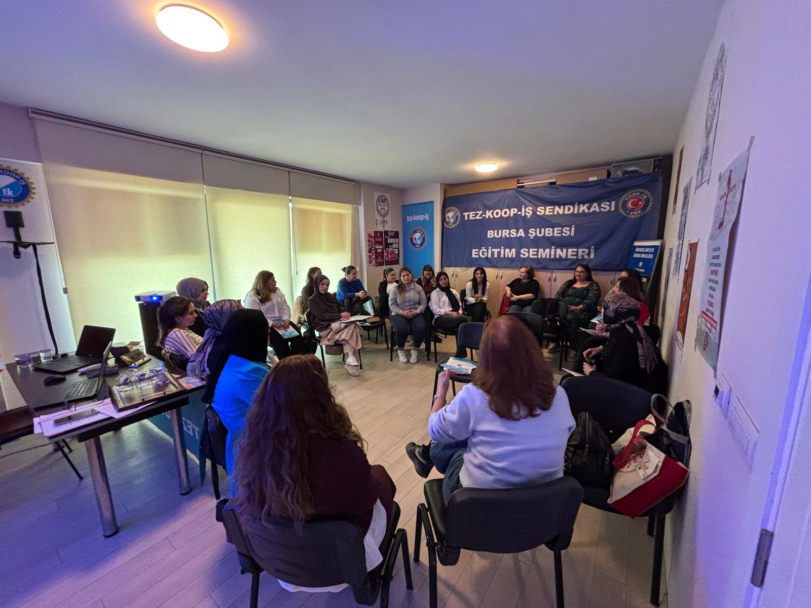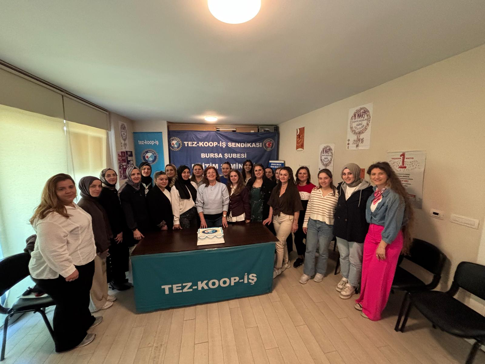 Bursa şubemiz 14.04.2026 günü, tam gün olarak planladığı “Kadın Temsilciler Güçlenme Atölyesini” kadın mücadelesine ve sendikal alana ilişkin detaylı düşünceler ve güçlü duygularla tamamladı. Kadın Çalışma Kurulunun Bursa Şubemizde ilk etkinliği olarak kayda geçen, günün sonunda yapılan değerlendirmenin sonuçlarıyla da tutarlı olarak atölye, katılımcıların yoğun ilgisi ile karşılandı. Kadın temsilciler ne evde ne de işyerinde idiler; gündelik yaşamın rutininin dışında, üçüncü kamusal mekanları olan ve onlarca yıllara yaslanan çok güçlü deneyimiyle bir okul olan Tez-Koop-İş Sendikası Bursa şubemizdeydiler. Temsilciler, kendi hikayeleri eşliğinde işyerleri ve ikinci vardiya olan ev ortamı üzerinde hep birlikte düşündüler ve düşünmeye devam edecekler.