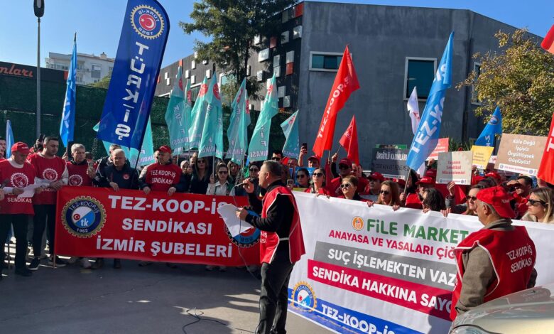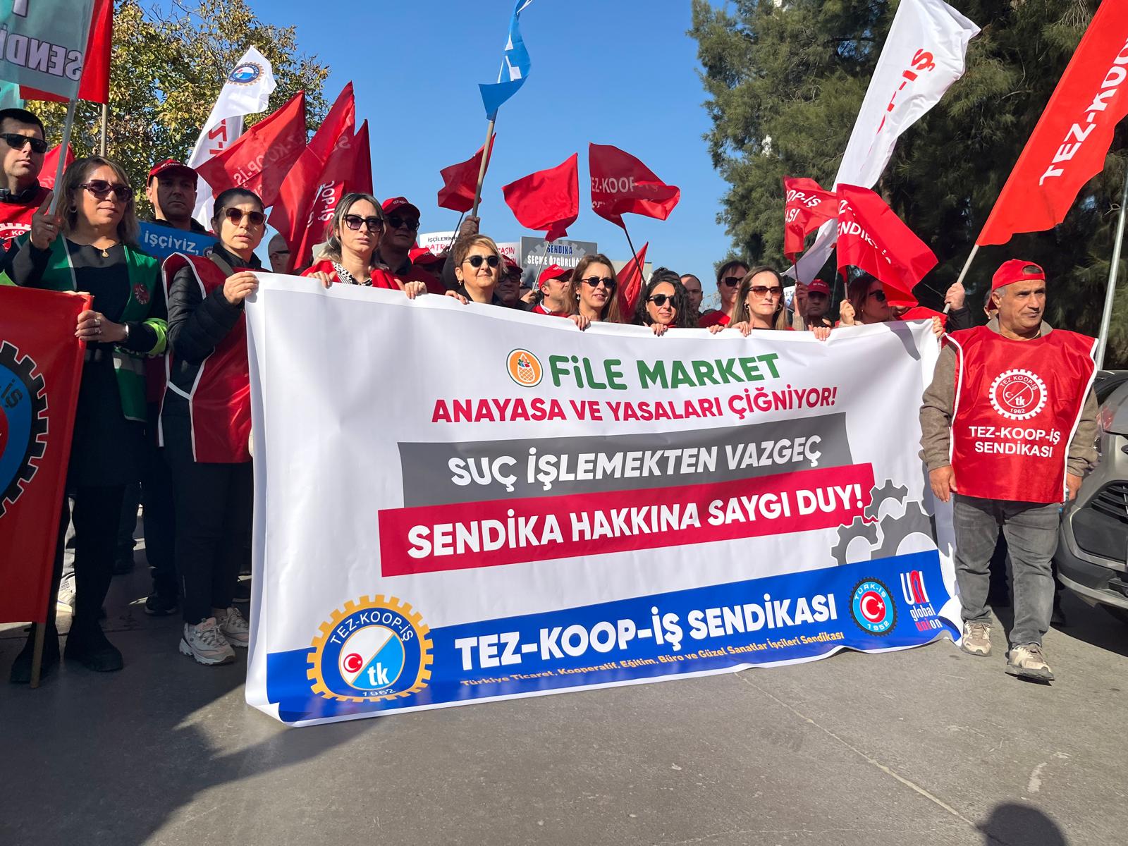 Tez-Koop-İş Sendikası olarak File Market işçilerinin sendikalaşma hakkı tanınıncaya kadar mücadelemizi sürdüreceğiz. File Market’in sendika karşıtı inadını kırmak için tüm emek ve meslek örgütleri ile sınıf dostlarını dayanışmayı büyütmeye çağırıyoruz.