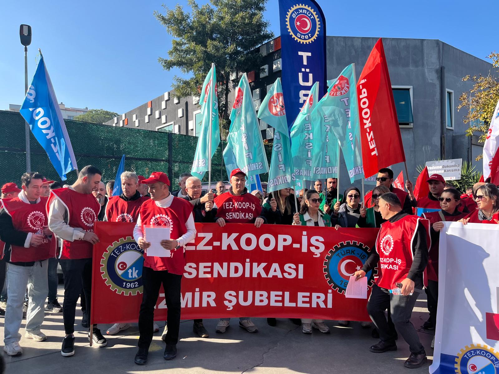 Tez-Koop-İş Sendikası olarak, File Market yönetiminin sendikal hakları tanımayan, işçi düşmanı ve hukuksuz tutumuna karşı İstanbul’da başlayan direnişimiz, 12 Aralık 2025 tarihinde İzmir sokaklarında yankılandı.
