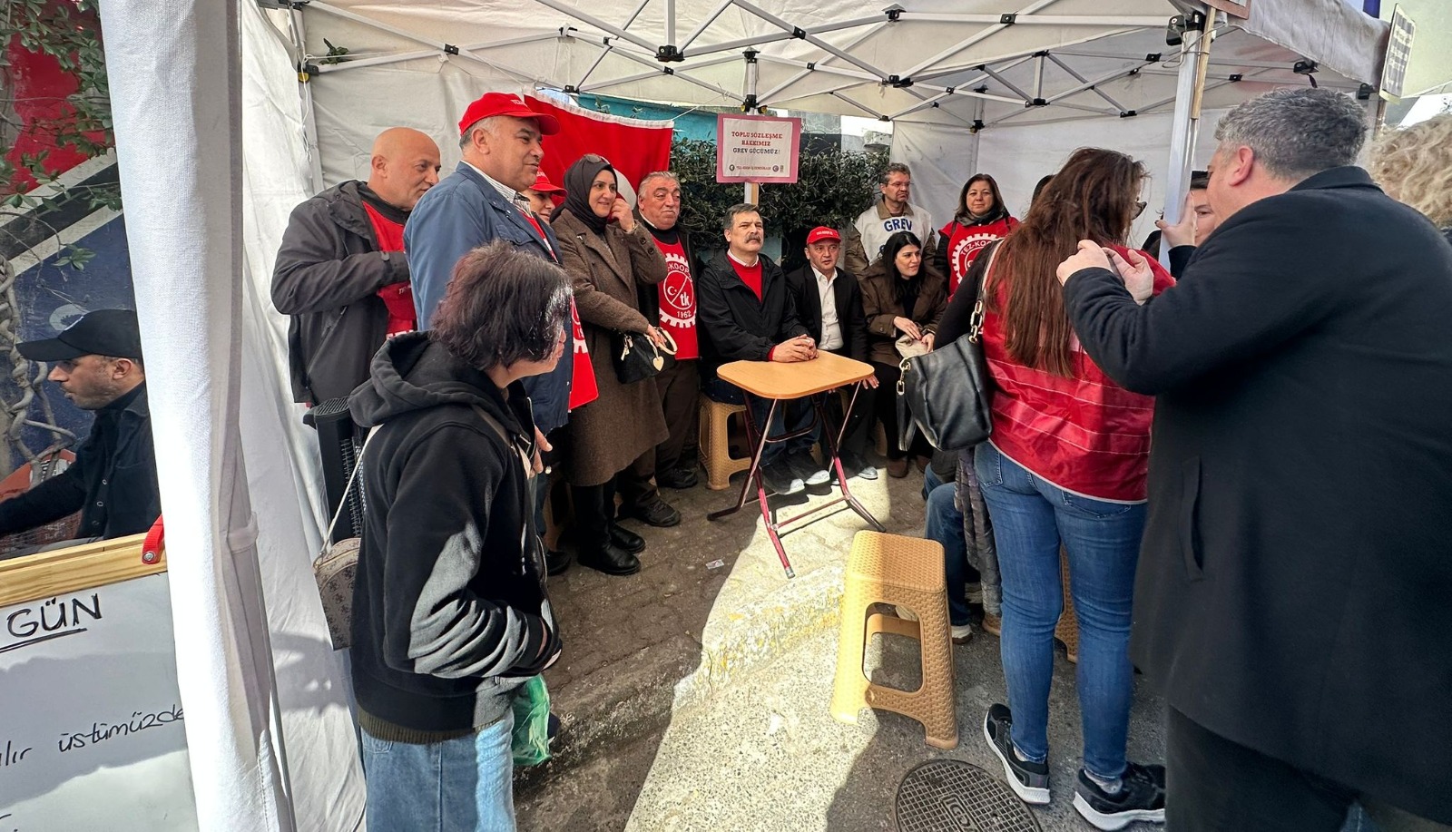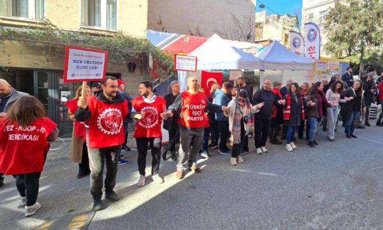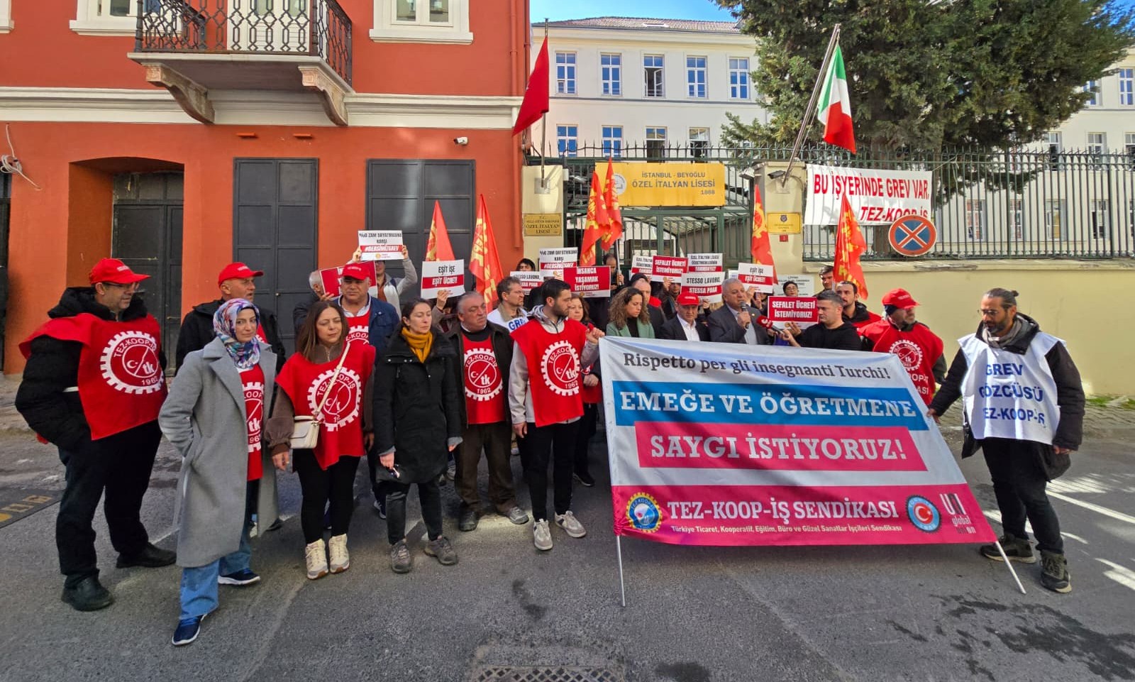 Özel İtalyan Lisesi önünde 38 gündür grevde olan Tez-Koop-İş Sendikası üyesi öğretmenler, sadece kendi gelecekleri için değil, Türkiye’deki tüm özel okul öğretmenlerinin ve işçi sınıfının onuru için direnmeye devam ediyor. Grevin 38. gününde (11 Mart 2026), TİP Genel Başkanı Erkan Baş ve İstanbul İl Örgütü; EMEP Genel Başkanı Seyit Aslan, İstanbul İl Başkanı Sema Barbaros ve parti heyeti; DEM Parti Erzurum Milletvekili Meral Danış Beştaş grev alanımızı ziyaret ederek haklı mücadelemize destek verdi.