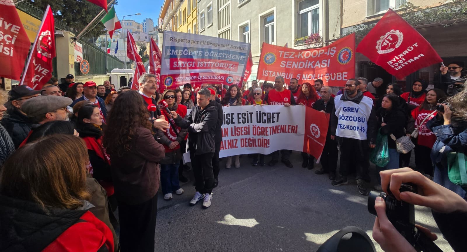 “Koskoca devletin bakanlığı, İtalyan Lisesindeki grevi nasıl kırarız diye Ali Cengiz oyunları yapıyor. Buradan kamu emekçisi arkadaşlarıma sesleniyorum: Bu onursuzluğu, bu grev kırıcılığı reddedin! Bu size yüklenen bir angaryadır. Sizi sınıf kardeşlerinizle karşı karşıya getirmek isteyen hukuksuz talimatları uygulamayın.”